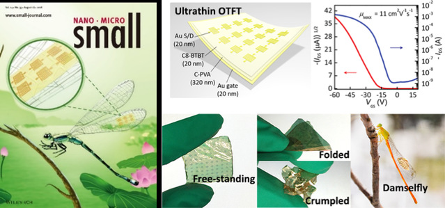 超薄有机场效应晶体管具有质量轻、超柔性及可随形贴合的优势,在制备电子皮肤等可穿戴电子设备中具有良好的应用前景。相比于在传统的刚性衬底上制备的有机场效应晶体管器件,超薄的有机场效应晶体管迁移率普遍较低(10-1 cm2 V-1 s-1),限制了其进一步发展。针对这种问题,汤庆鑫课题组于2018年8月在Small(2018, 14, 1801020)发表了题为“High-Performance, Ultrathin, Ultraflexible Organic Thin-Film Transistor Array”的研究论文,并被选为封面文章重点介绍。在该论文中,通过溶液法制备了自支撑的高性能有机薄膜场效应晶体管阵列,迁移率最高可达11 cm2 V-1 s-1。器件的厚度仅为380 nm,质量约为 0.89 g cm-2,因此这种器件可以贴合于三维曲面、人体皮肤甚至昆虫豆娘的翅膀上而不影响其翅膀的振动及飞行,并且在折叠状态下器件仍然可以正常工作。