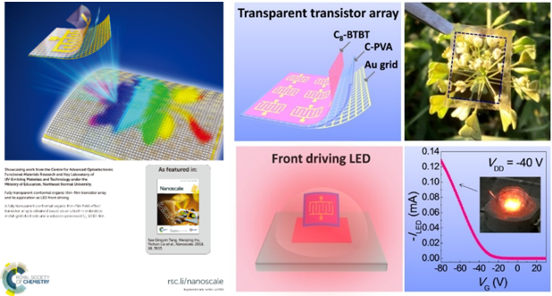 这种通过溶液法制备的超薄有机场效应晶体管器件还可以与透明电极相结合,得到透明可贴合的有机场效应晶体管器件。其透明度在可见光全波段均大于80%,迁移率可达2 cm2 V-1 s-1,具有良好的机械稳定性及光稳定性。该器件优异的光电性能可实现有机晶体管在前置驱动电路中的应用,展示了其在透明可贴合主动矩阵显示中的应用潜力。该结果发表在学术期刊Nanoscale上(2018, 10, 3613),并被选为封面文章。