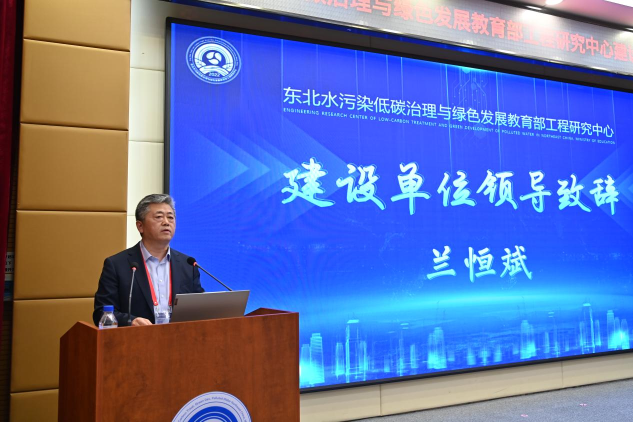 兰恒斌代表学校在会上致辞。他介绍了学校历史沿革、人才培养、教育教学、“双一流”学科建设等情况,指出我校是国内最早从事环境科学人才培养的高校之一,一直高度重视环境学科的建设与发展,特别是在研发与推广水环境治理与水生态修复技术方面取得突破性成果。东北水污染低碳治理与绿色发展工程研究中心获批成立,不仅代表了教育部对我校环境学科建设的充分肯定,更对促进东北区域生态文明建设、国家“双碳”目标实现以及国家生态环境高层次人才队伍建设具有重要意义。未来,学校将牢固践行绿色低碳循环发展的理念,加强顶层设计,对中心建设给予充分保障和支持;充分发挥环境生态学科优势,在东北区域水污染治理新理论、新技术、新装备等方向持续探索发力;进一步加强主动谋划、对接、服务国家和行业产业发展需要,与共建单位加强合作,推进科研成果转化,促进东北老工业基地从工业文明向生态文明的低碳绿色转型。