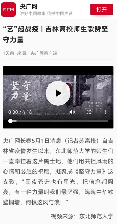 音乐学院出品原创歌曲《坚守力量》被多家媒体转载