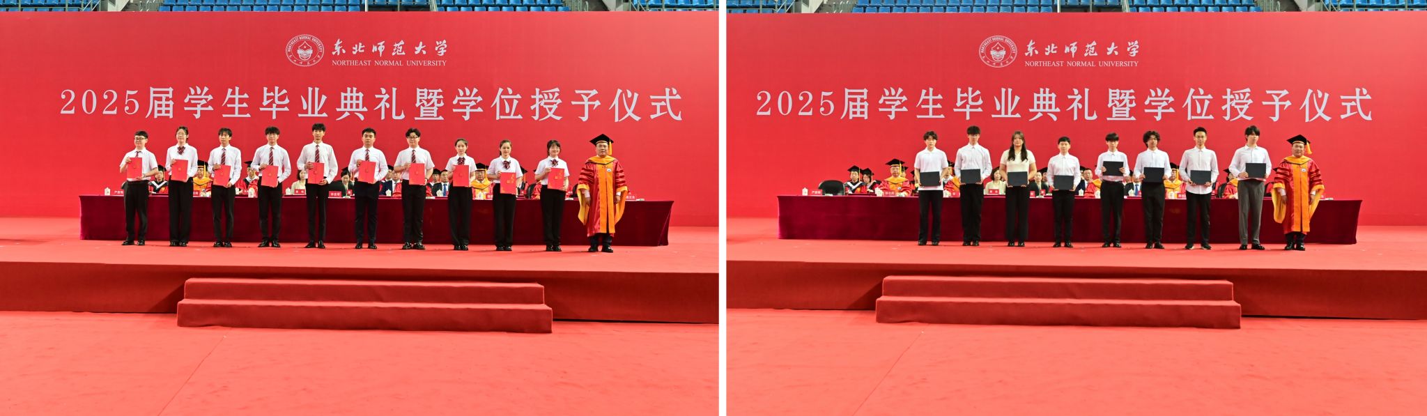 教师代表、传媒科学学院院长史册勉励毕业生铭记校园点滴铸就的情感纽带,传承东师自延安烽火中淬炼的“师道之光”,在未来的道路上携“责任、勇敢、快乐”前行,以教育报国之志续写东师人新的传奇。本科生代表、马克思主义学部2025届本科毕业生秦宇烁分享了自己从汶川考入东师,努力实现青春价值、探索成长意义的故事,将带着东师人的“四实品格”,在平凡的岗位上书写不凡的篇章。研究生代表、经济与管理学院2025届博士研究生谷城表示东师厚重求实、包容开放的精神沃土,滋养了自己为学、为事、为人的坚实根基,立志要以躬耕者的姿态,做一名扎根讲台、播撒希望的人民教师。留学生代表、巴基斯坦籍博士研究生安林代表2025届全体毕业留学生向母校的培养和全体师生表达了感谢,并表示将带着在母校积累的知识,为促进民心相通、推动构建人类命运共同体贡献力量。校友代表、数学系1988级本科校友、全国模范教师、哈尔滨市第三中学校长王健勉励毕业生永葆教育初心,勇立教育潮头,坚持终身学习,将个人理想融入国家发展的宏伟蓝图,与时代发展同频共振,做永不停歇的追光者。